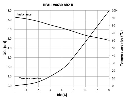Das Diagramm in Abbildung 3 zeigt die Roll-off-Beziehung zwischen Nenninduktivität, Gleichstrom und Temperatur für die Induktivität HPAL1V0630-8R2-R.