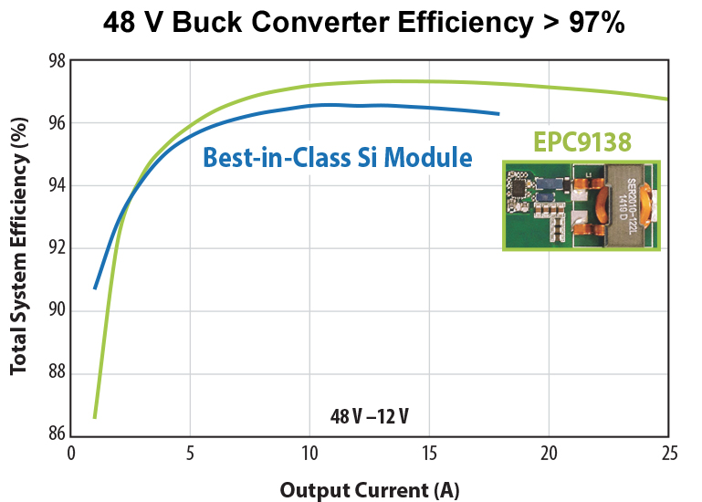 48 V = GaN: In allen Topologien mit 48 VIN tritt der höchste Wirkungsgrad bei der Verwendung von GaN-Komponenten auf.