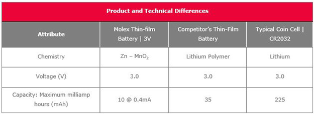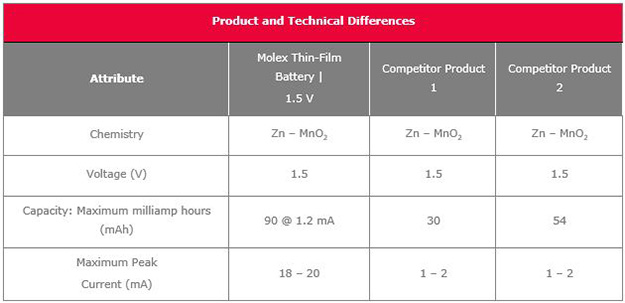Het is ook het vermelden waard dat de Zn-MnO2 batterij van Molex betere prestaties levert dan andere batterijen met dezelfde chemische samenstelling. Zoals uit de volgende tabel blijkt, zijn de chemische samenstellingen identiek maar leveren de dunne-filmbatterijen van Molex zowel voor wat de capaciteit als de maximale piekstroom betreft betere prestaties dan dunne-filmbatterijen van concurrenten.